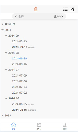 每日记录按年月日组织,要项记录可按需要自由组织。以树形结构展示、查看。